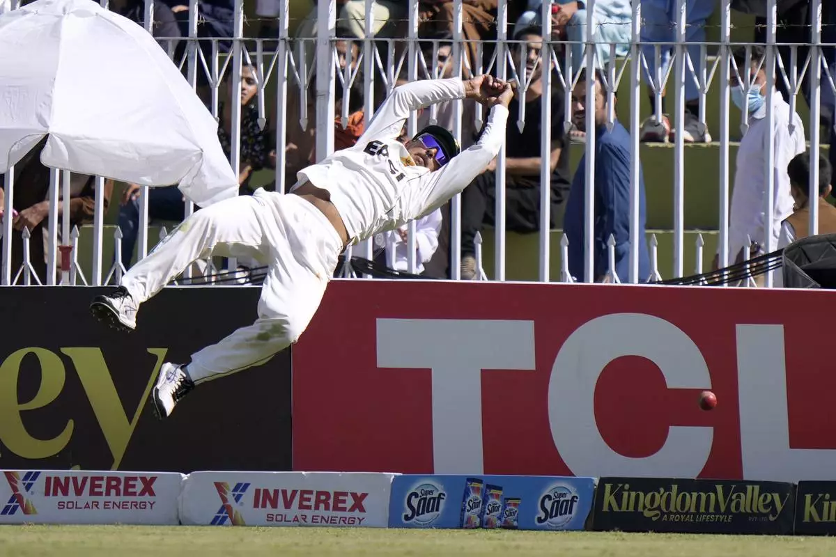 Pakistan's Saim Ayub jumps to take a catch of England's Jamie Smith on the boundary edge during the day one of third test cricket match between Pakistan and England, in Rawalpindi, Pakistan, Thursday, Oct. 24, 2024. (AP Photo/Anjum Naveed)