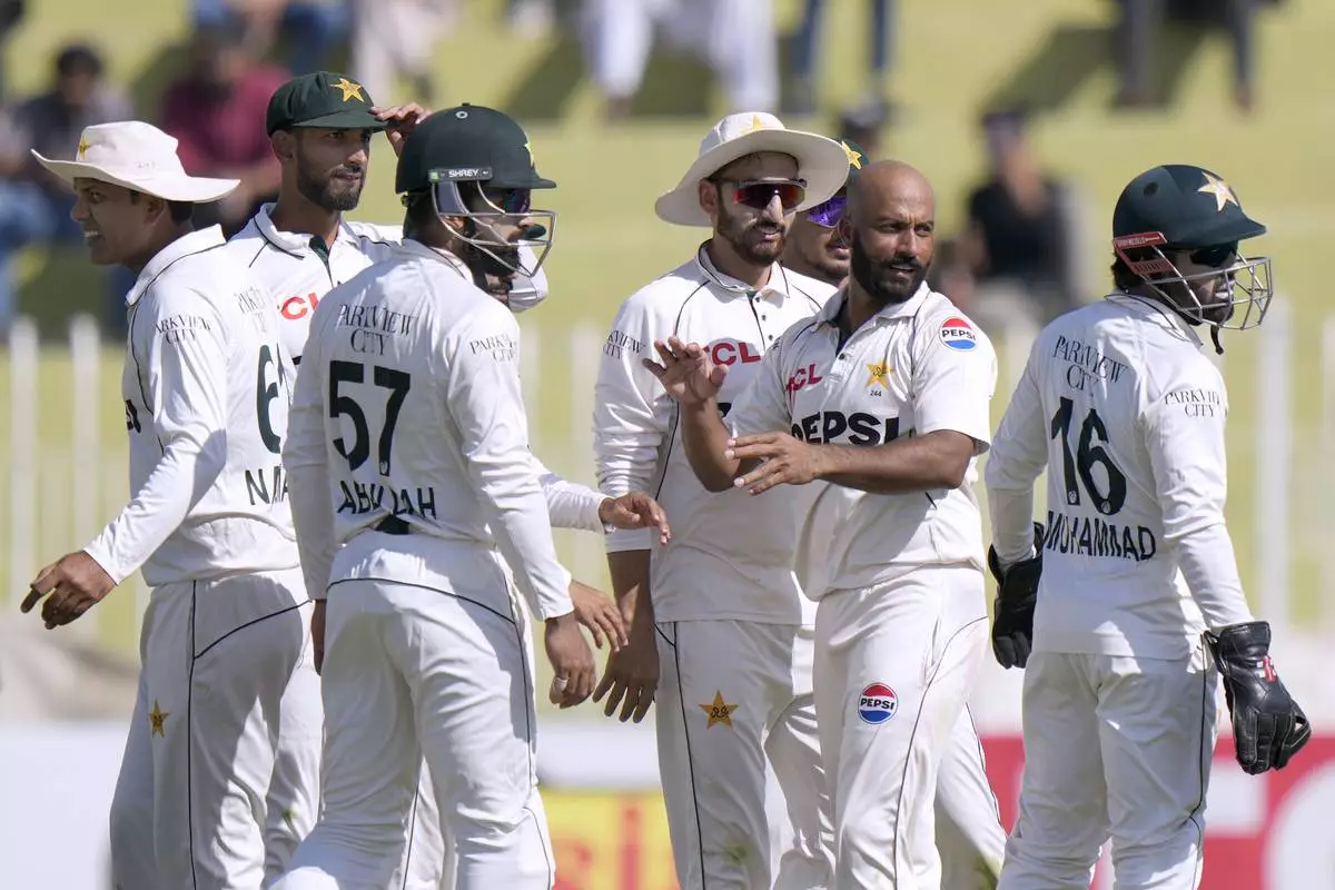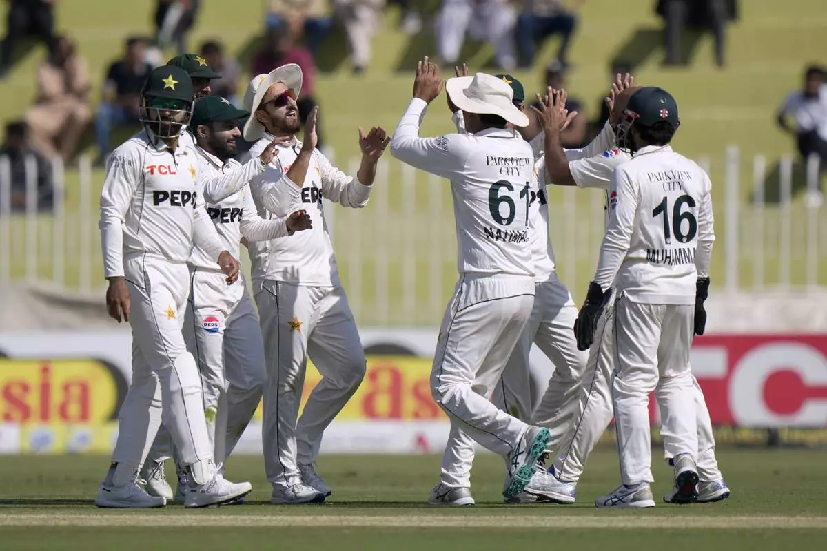 Pakistan's Salman Ali Agha, center, celebrates with teammates after taking the catch of England's Ben Stokes during the day one of third test cricket match between Pakistan and England, in Rawalpindi, Pakistan, Thursday, Oct. 24, 2024. (AP Photo/Anjum Naveed)