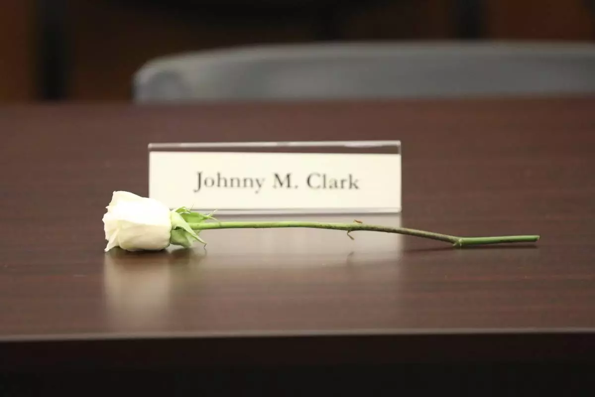A white rose and a nameplace honor one of five men who died before their records could be cleared after they were arrested in 1960 for sitting at an all-white South Carolina lunch counter on Friday, Oct. 25, 2024, in Columbia, S.C. (AP Photo/Jeffrey Collins)