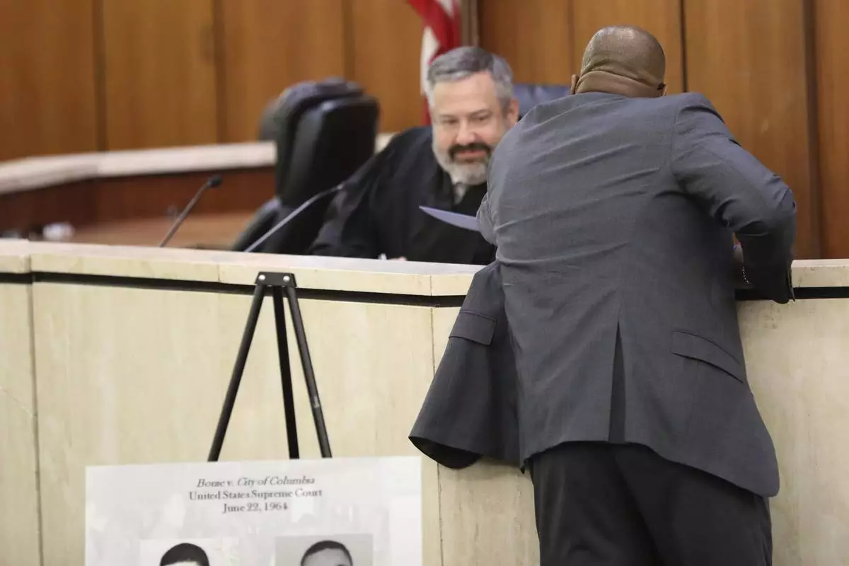 Charles Barr, foreground, speaks to Judge Robert Hood during a hearing where Barr's record was cleared after he was arrested in 1960 for sitting at an all-white South Carolina lunch counter on Friday, Oct. 25, 2024, in Columbia, S.C. (AP Photo/Jeffrey Collins)