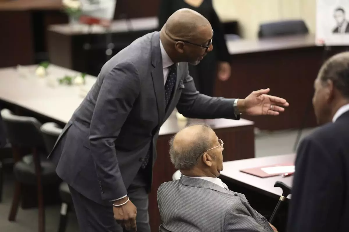 Solicitor Byron Gipson, left, shows Simon Bouie. seated, where he will speak during a hearing where Bouie's record was cleared after he was arrested in 1960 for sitting at an all-white South Carolina lunch counter on Friday, Oct. 25, 2024, in Columbia, S.C. (AP Photo/Jeffrey Collins)