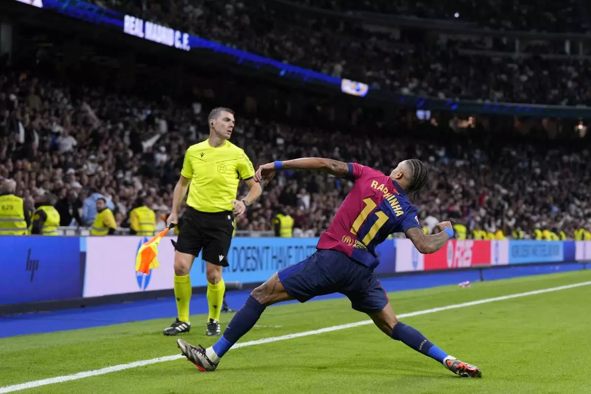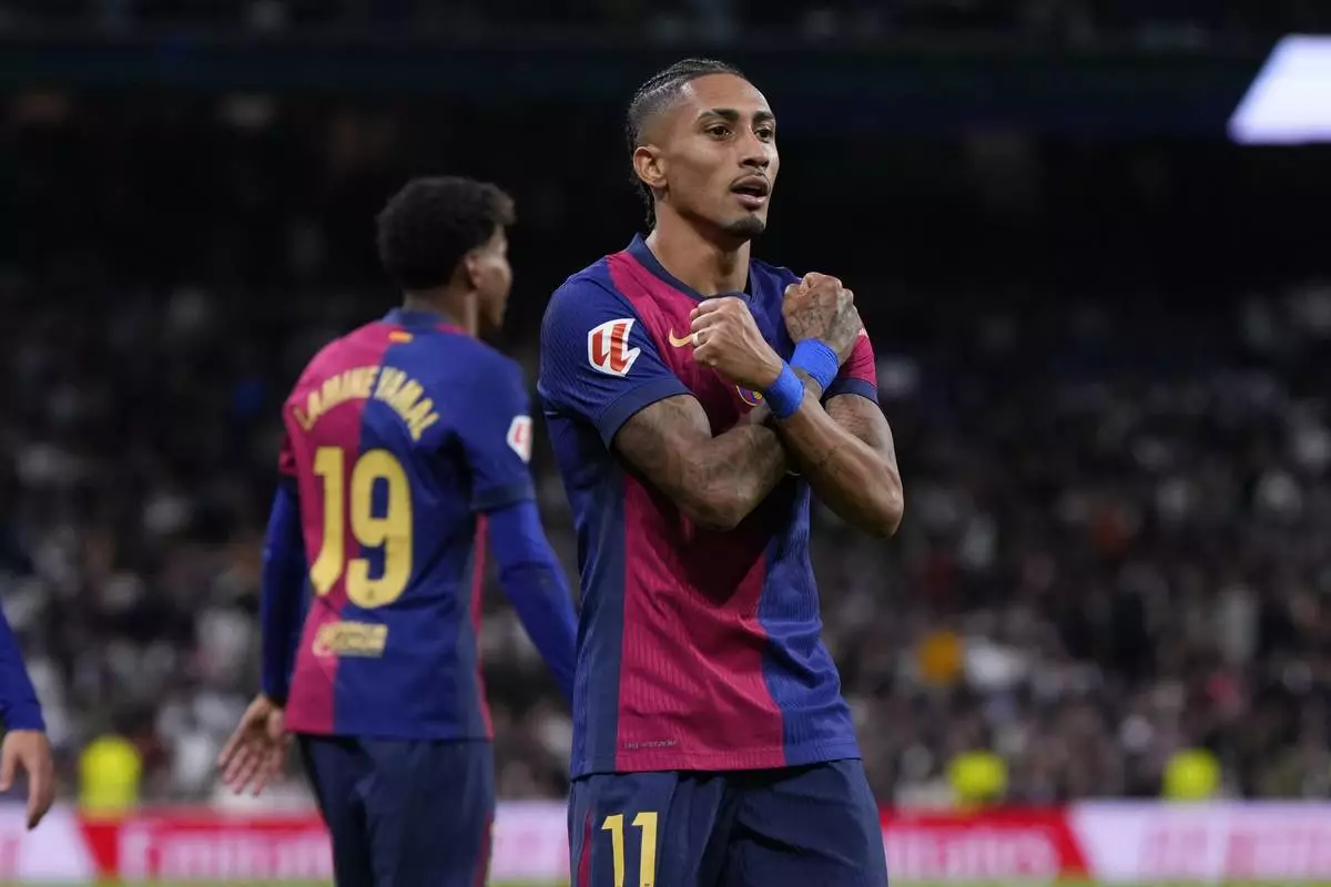 Barcelona's Raphinha celebrates after scoring his side's fourth goal during a Spanish La Liga soccer match between Real Madrid and Barcelona at the Santiago Bernabeu stadium in Madrid, Spain, Saturday, Oct. 26, 2024. (AP Photo/Manu Fernandez)