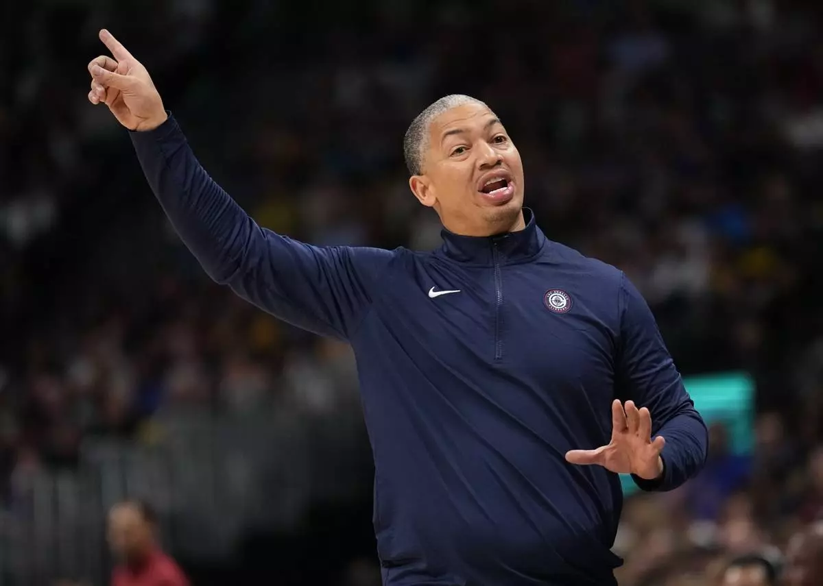 Los Angeles Clippers head coach Tyronn Lue reacts during the first half of an NBA basketball game against the Denver Nuggets, Saturday, Oct. 26, 2024, in Denver. (AP Photo/Jack Dempsey)