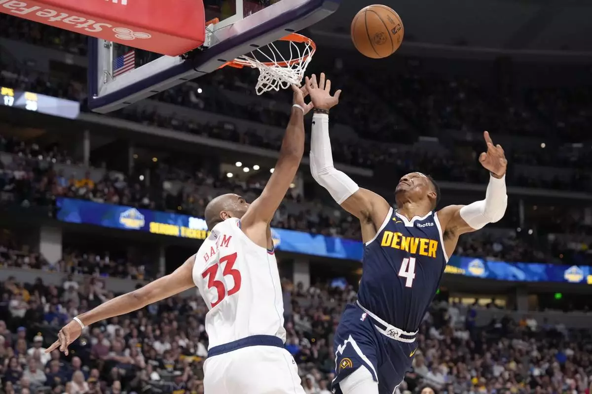 Los Angeles Clippers forward Nicolas Batum (33) blocks a shot against Denver Nuggets guard Russell Westbrook (4) during the first half of an NBA basketball game Saturday, Oct. 26, 2024, in Denver. (AP Photo/Jack Dempsey)