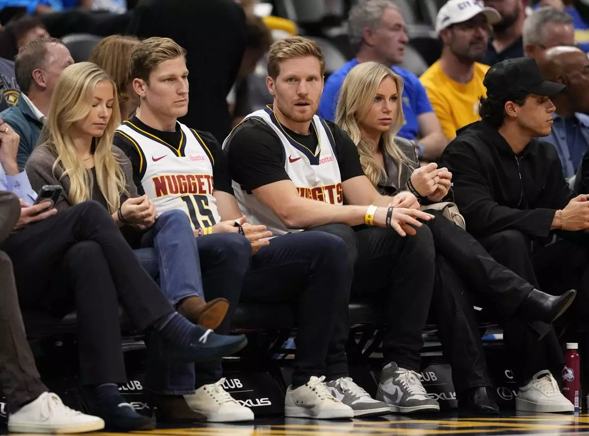 Colorado Avalanche players Nathan MacKinnon, left, and Gabriel Landeskog attend the first half of an NBA basketball game between the Denver Nuggets and the Los Angeles Clippers, Saturday, Oct. 26, 2024, in Denver. (AP Photo/Jack Dempsey)