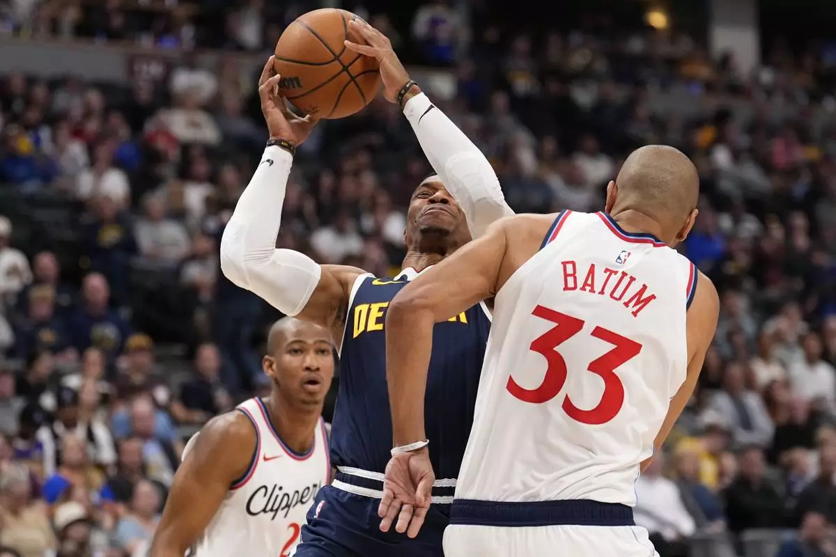 Los Angeles Clippers forward Nicolas Batum (33) fouls Denver Nuggets guard Russell Westbrook (4) during the first half of an NBA basketball game Saturday, Oct. 26, 2024, in Denver. (AP Photo/Jack Dempsey)