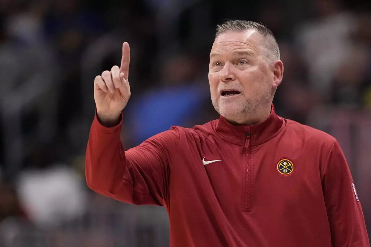 Denver Nuggets head coach Michael Malone reacts during the first half of an NBA basketball game against the Los Angeles Clippers, Saturday, Oct. 26, 2024, in Denver. (AP Photo/Jack Dempsey)