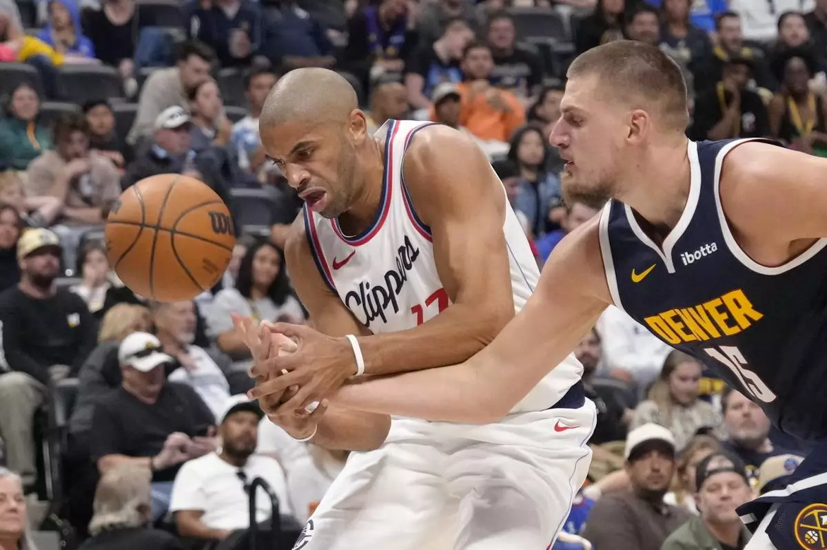 Los Angeles Clippers forward Nicolas Batum (33) and Denver Nuggets center Nikola Jokic (15) reach for a loose ball during the first half of an NBA basketball game Saturday, Oct. 26, 2024, in Denver. (AP Photo/Jack Dempsey)
