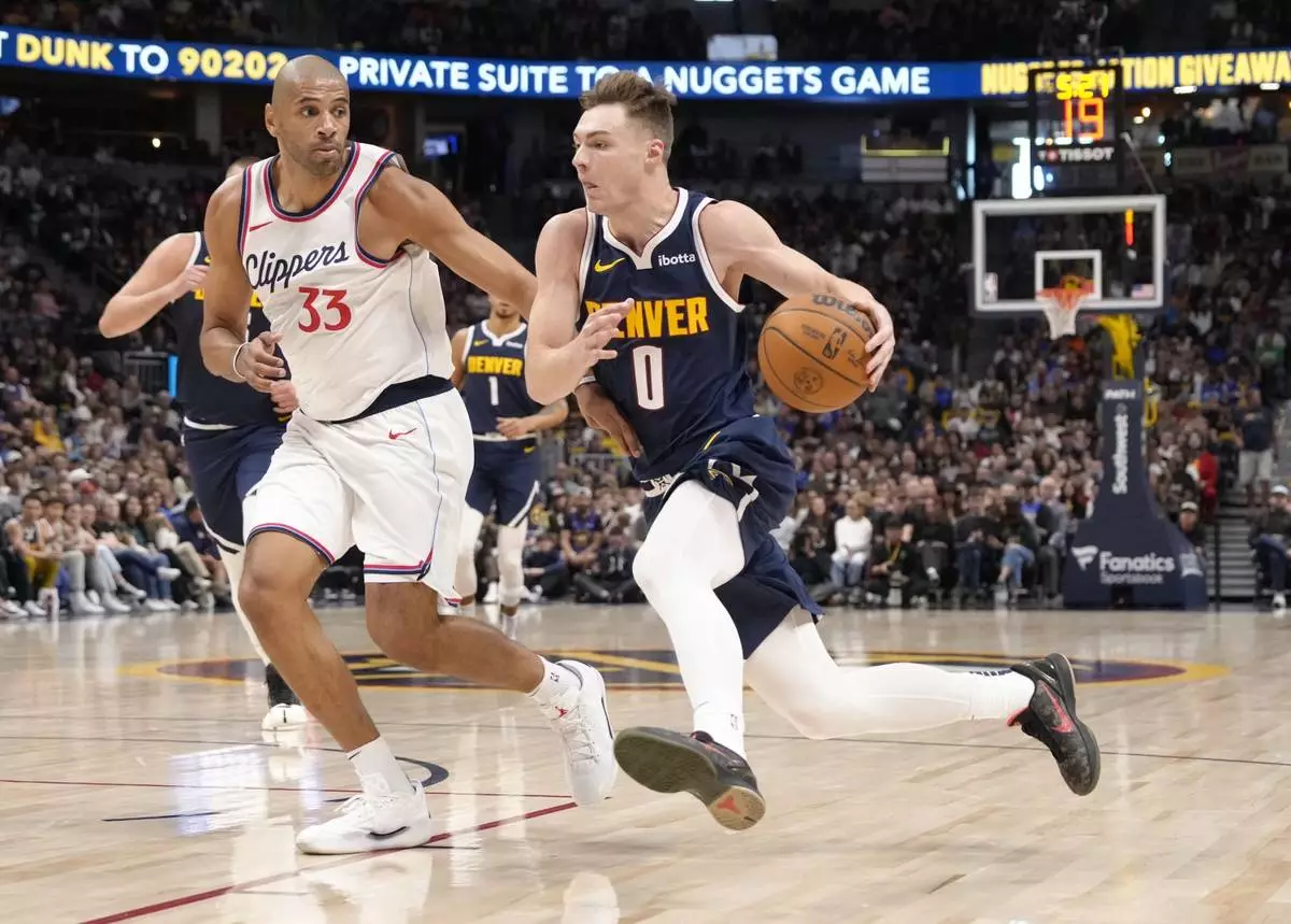 Denver Nuggets guard Christian Braun (0) drives to the basket past Los Angeles Clippers forward Nicolas Batum (33) during the first half of an NBA basketball game Saturday, Oct. 26, 2024, in Denver. (AP Photo/Jack Dempsey)