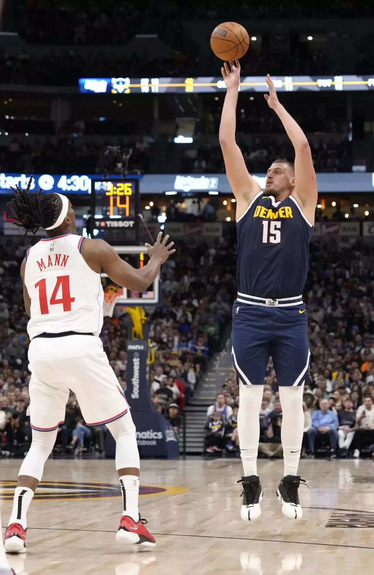 Denver Nuggets center Nikola Jokic (15) shoots a 3-point basket over Los Angeles Clippers guard Terance Mann (14) during the first half of an NBA basketball game Saturday, Oct. 26, 2024, in Denver. (AP Photo/Jack Dempsey)