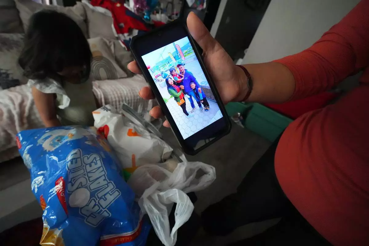 Cristina Osornio shows a photo, Nov. 18, 2025, in Rogers, Ark., from a recent trip to San Luis Potosi, Mexico, where she took her two daughter to see her husband, Edwin Sanchez-Mendoza, who signed deportation papers after being held in an immigration detention center for several months. (AP Photo/Julio Cortez)