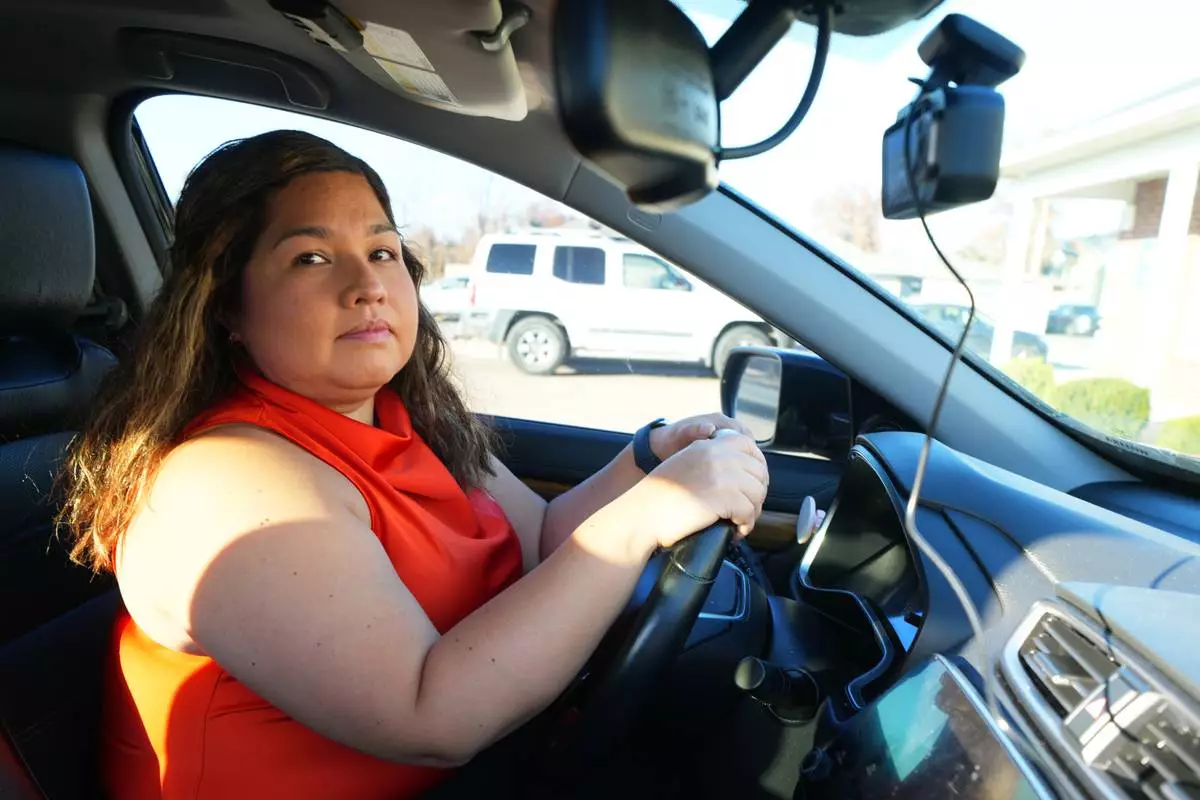 Immigration attorney Lilia Pacheco poses for a photo in her vehicle, which has a surveillance camera she installed on the windshield in order to record interactions with police should she be pulled over, Nov. 18, 2025, in Rogers, Ark. (AP Photo/Julio Cortez)