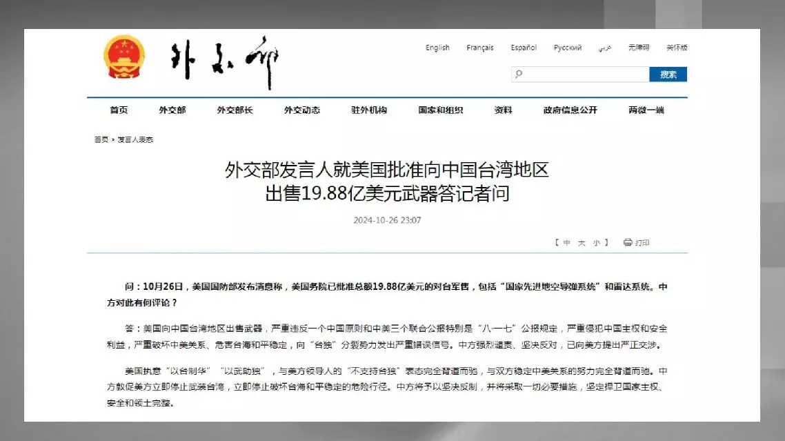 The spokesperson made the remarks in response to a reporter's query that the U.S. Defense Department on Saturday announced that the U.S. State Department has approved 1.988 billion U.S. dollars in arms sales to Taiwan, including the "National Advanced Surface-to-air Missile Systems" and radar systems.