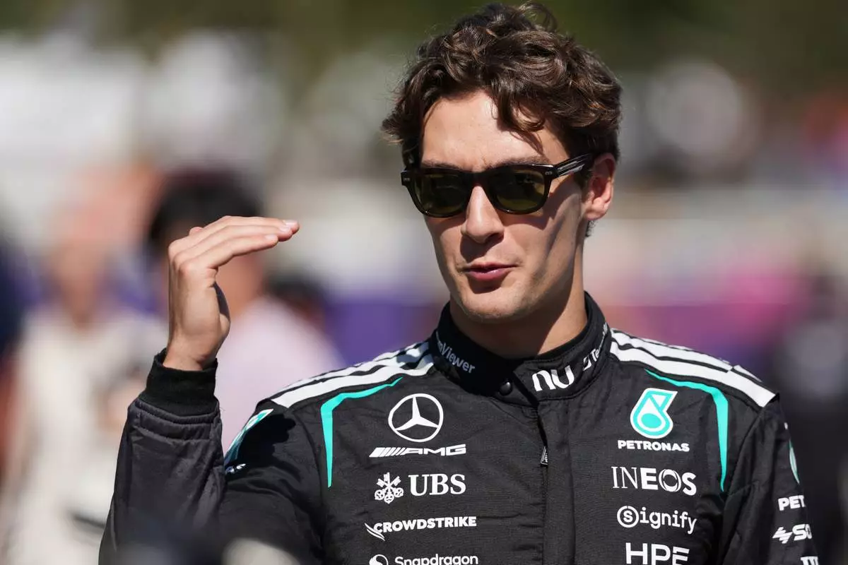 Mercedes driver George Russell of Britain gestures as he walks down the F1 Paddock ahead of the Australian Formula One Grand Prix at Albert Park, in Melbourne, Australia, Thursday, March 5, 2026. (AP Photo/Heath McKinley)