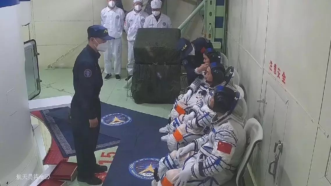 Cai Xuzhe, the mission commender, and his crew mates Song Lingdong and Wang Haoze climbed aboard the spaceship with the help of technicians.