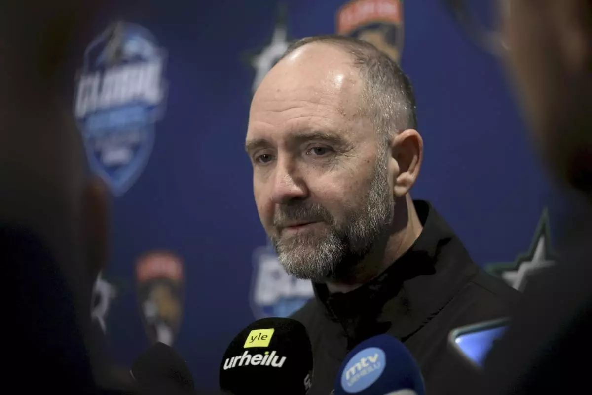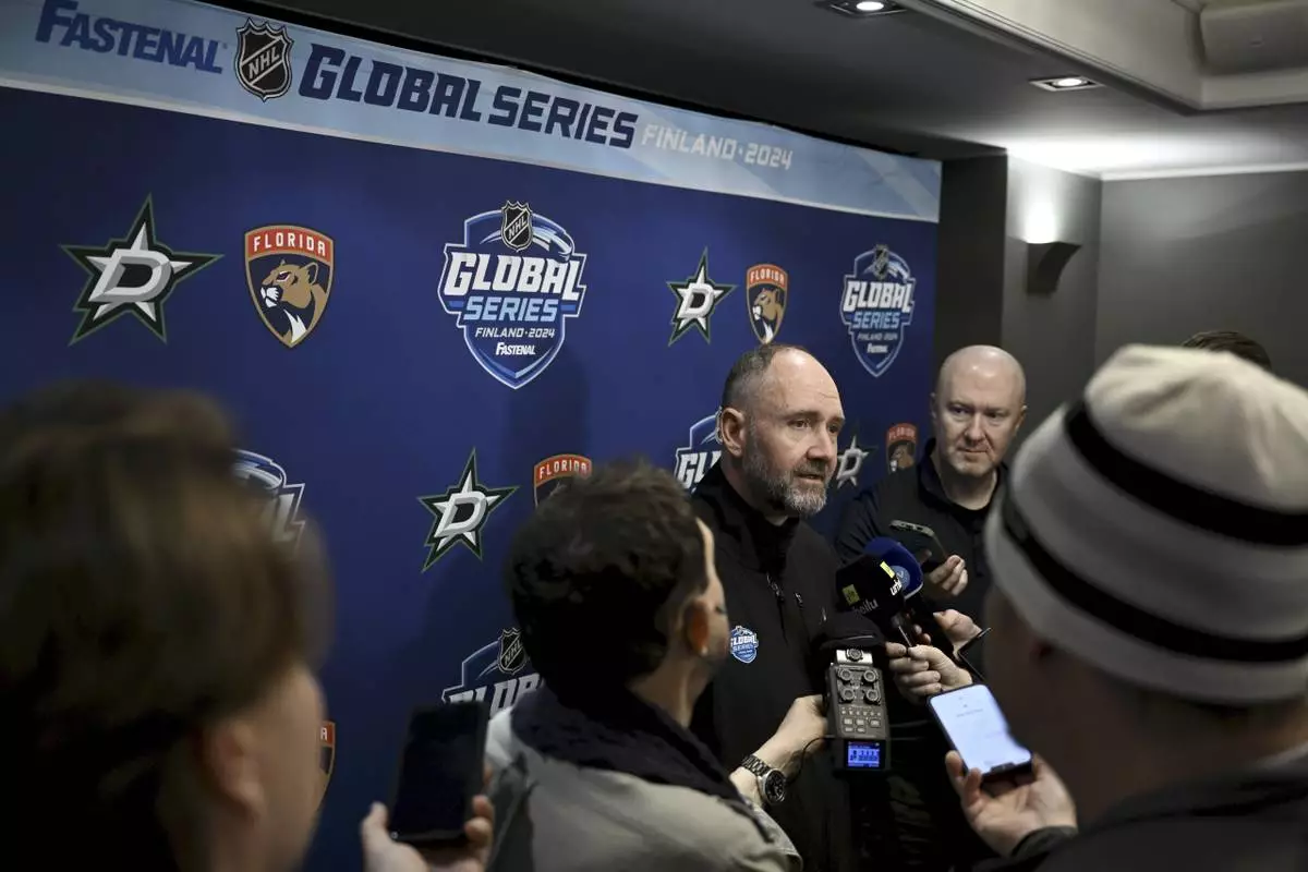 Head coach Pete DeBoer of the NHL ice hockey team Dallas Stars attends a press conference in Helsinki, Finland, Monday, Oct. 28, 2024. NHL teams Dallas Stars and Florida Panthers will face each other in NHL Global Series matches in Tampere next Friday and Saturday. (Emmi Korhonen/Lehtikuva via AP)