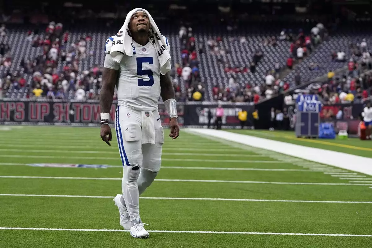 Indianapolis Colts quarterback Anthony Richardson walks off the field after an NFL football game against the Houston Texans, Sunday, Oct. 27, 2024, in Houston. The Texans won 23-20. (AP Photo/Tony Gutierrez)
