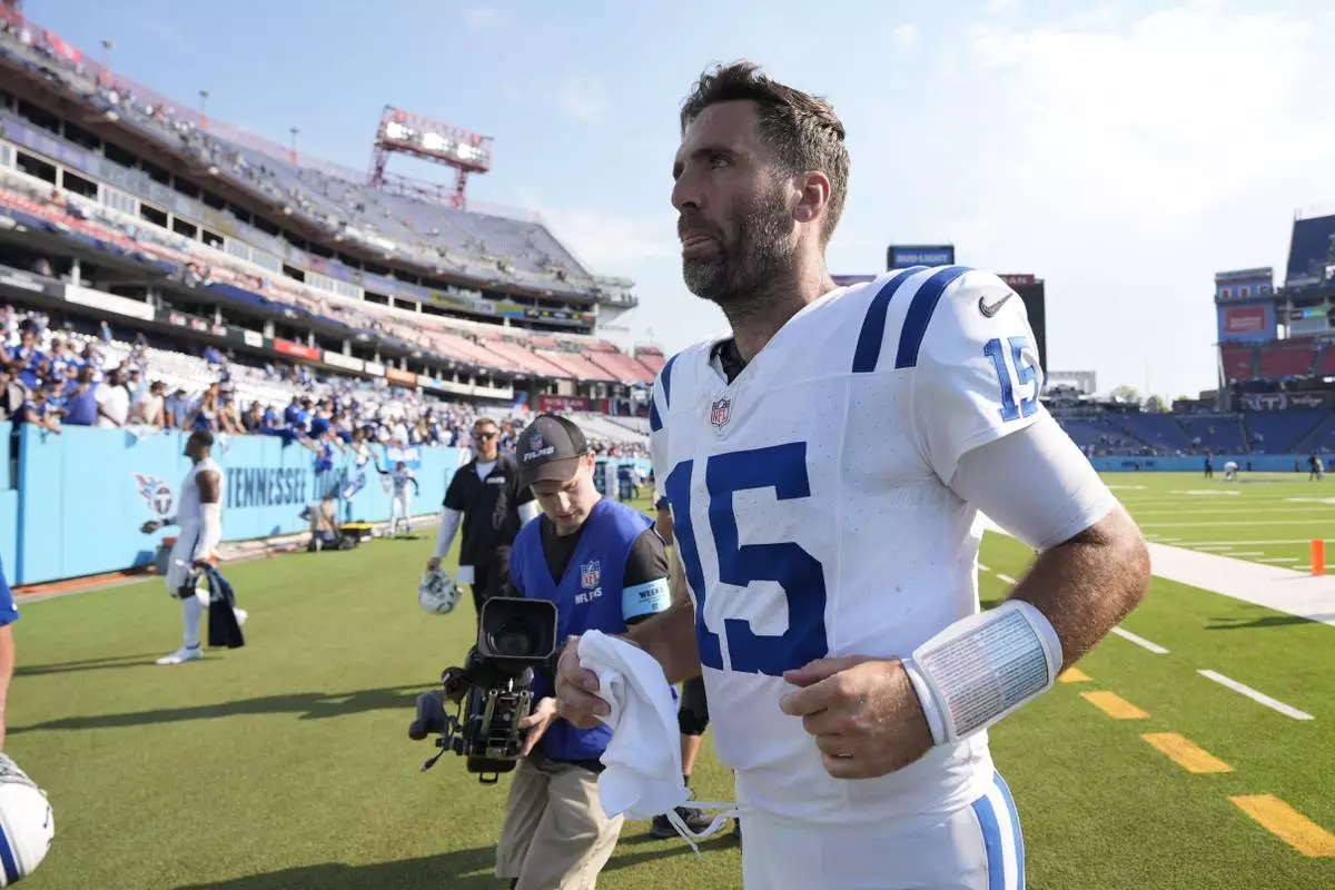 Indianapolis Colts quarterback Joe Flacco (15) runs off the field following an NFL football game against the Tennessee Titans, Sunday, Oct. 13, 2024, in Nashville, Tenn. (AP Photo/George Walker IV)