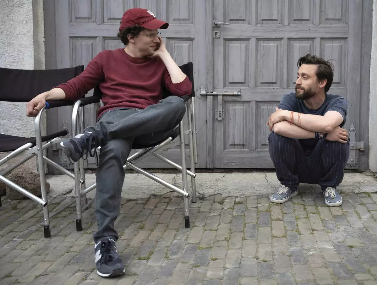 This image released by Searchlight Pictures shows Kieran Culkin, right, and Jesse Eisenberg on the set of "A Real Pain." (Searchlight Pictures via AP)