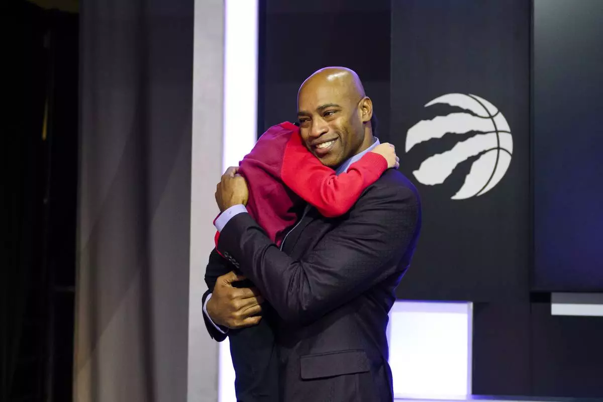 Former Toronto Raptors player Vince Carter hugs his son, Vince Carter Jr., after speaking to media ahead of his number retirement, before an NBA basketball game between the Toronto Raptors and the Sacramento Kings at the Scotiabank arena in Toronto on Saturday, Nov. 2, 2024. (Christopher Katsarov/The Canadian Press via AP)