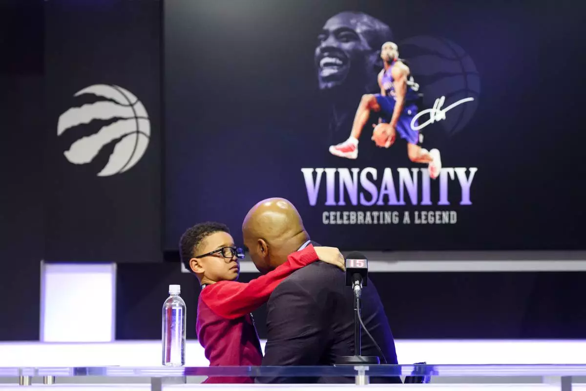 Former Toronto Raptors player Vince Carter is consoled by his son, Vince Carter Jr. while overcome by emotion when speaking to media ahead of his number retirement before an NBA basketball game between the Toronto Raptors and the Sacramento Kings at the Scotiabank arena in Toronto on Saturday, Nov. 2, 2024. (Christopher Katsarov/The Canadian Press via AP)