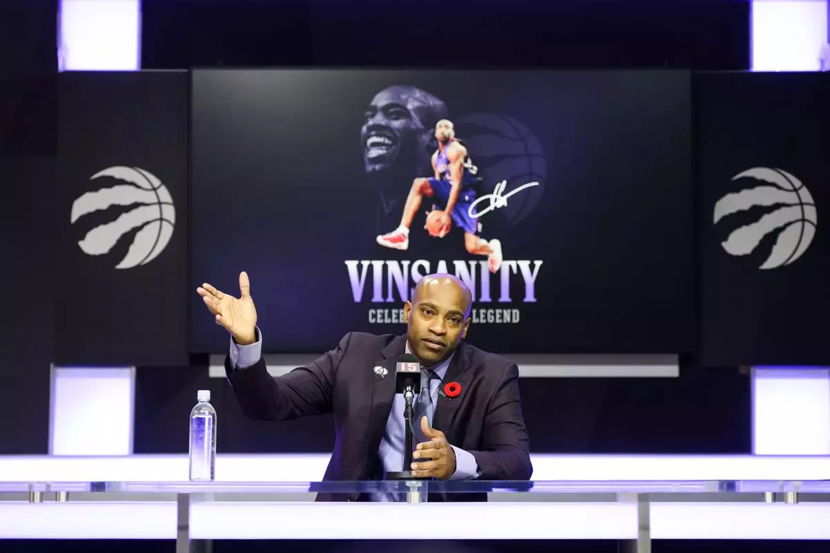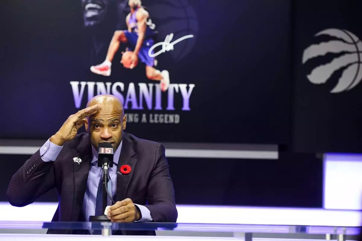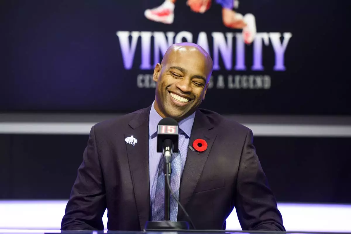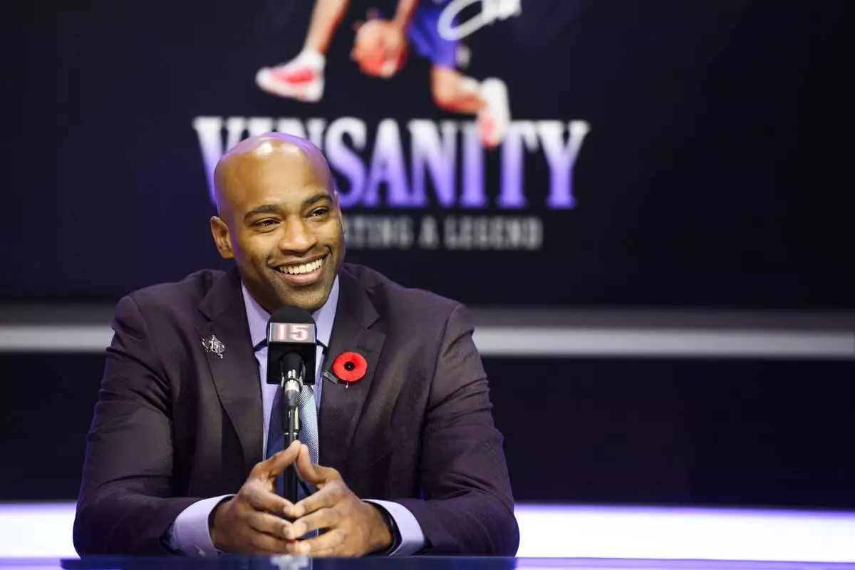 Former Toronto Raptors player Vince Carter speaks to media ahead of his number retirement, before an NBA basketball game between the Toronto Raptors and the Sacramento Kings at the Scotiabank arena in Toronto on Saturday, Nov. 2, 2024. (Christopher Katsarov/The Canadian Press via AP)