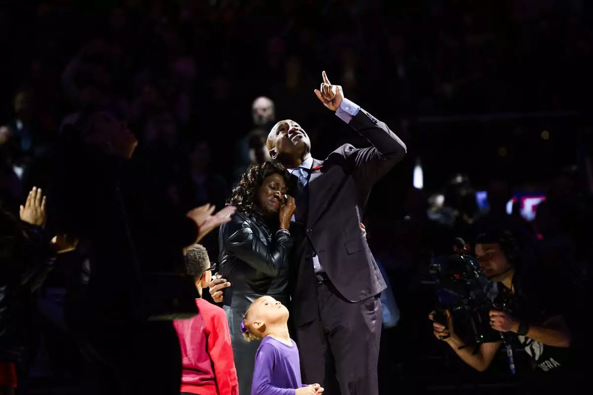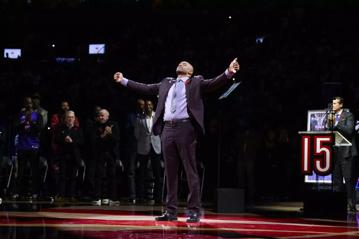 Former Toronto teammates Tracy McGrady, Antonio Davis, Kevin Willis, Charles Oakley, Morris Peterson, Dee Brown, Jerome Williams, Alvin Williams and Muggsy Bogues joined Carter, his family and Raptors president Masai Ujiri on the court for the ceremony.