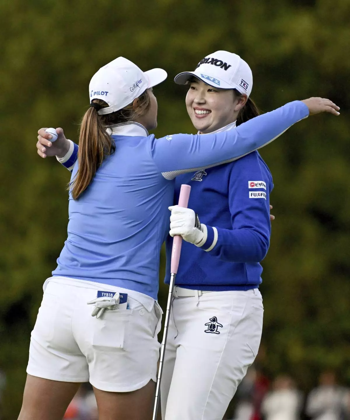 Rio Takeda of Japan, right, gets a hug from Marina Alex of the U.S. as she wins the LPGA's Toto Japan Classic in a playoff at the Seta Golf Course in Otsu, western Japan, Sunday, Nov. 3, 2024. (Keiji Uesho/Kyodo News via AP)