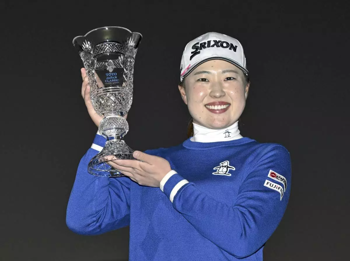 Rio Takeda of Japan holds up her trophy after winning the LPGA's Toto Japan Classic in a playoff at the Seta Golf Course in Otsu, western Japan, Sunday, Nov. 3, 2024. (Keiji Uesho/Kyodo News via AP)