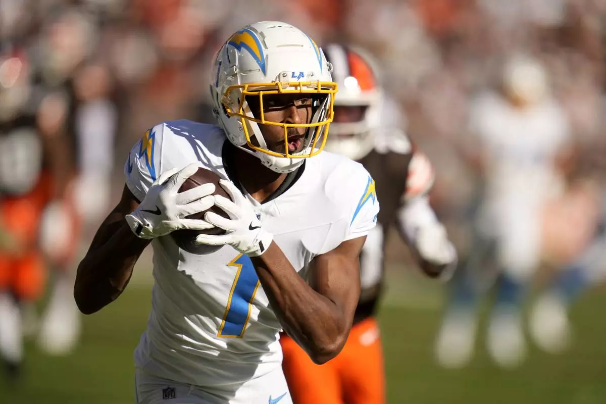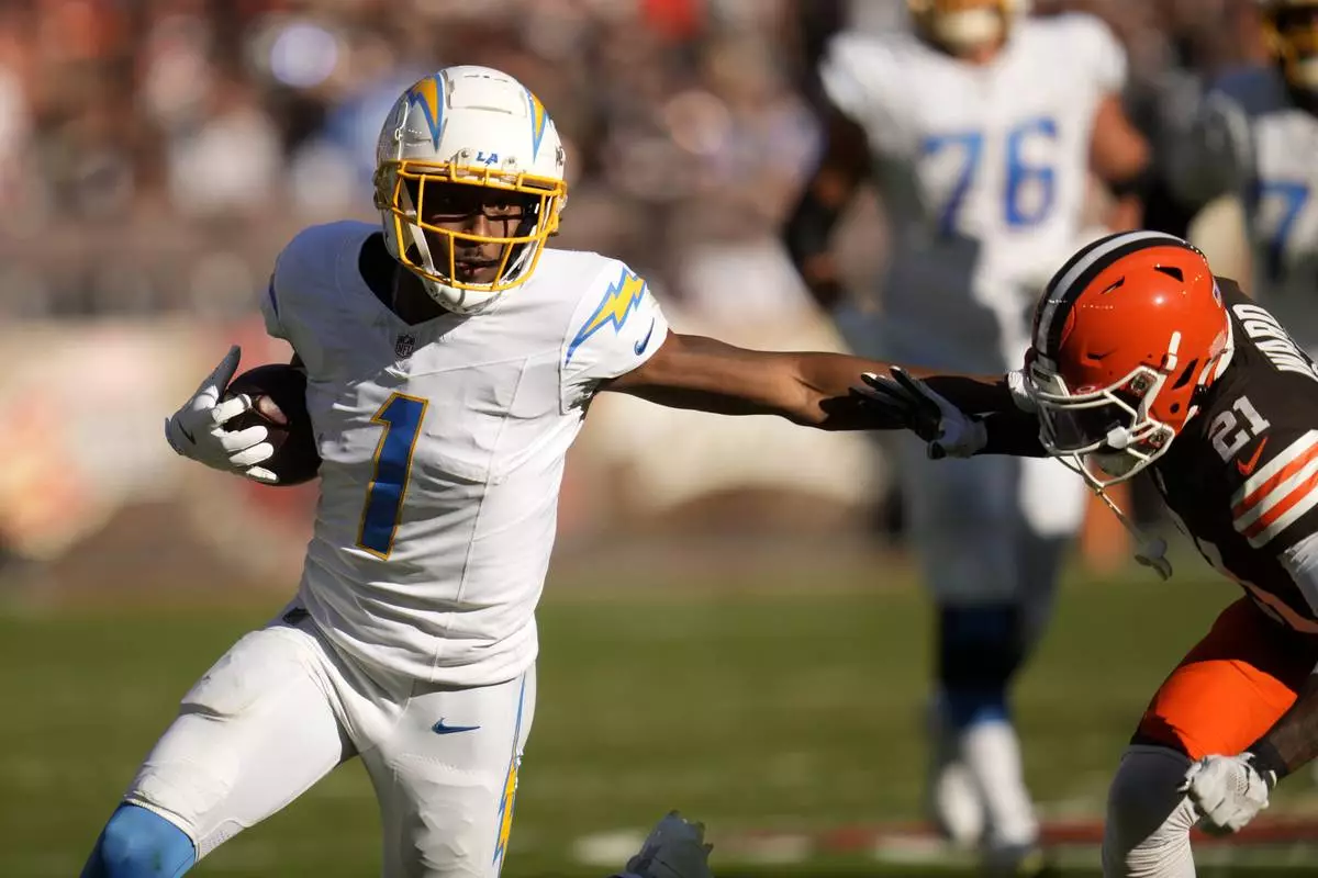 Los Angeles Chargers wide receiver Quentin Johnston (1) runs against Cleveland Browns cornerback Denzel Ward (21) in the first half of an NFL football game Sunday, Nov. 3, 2024, in Cleveland. (AP Photo/Sue Ogrocki)