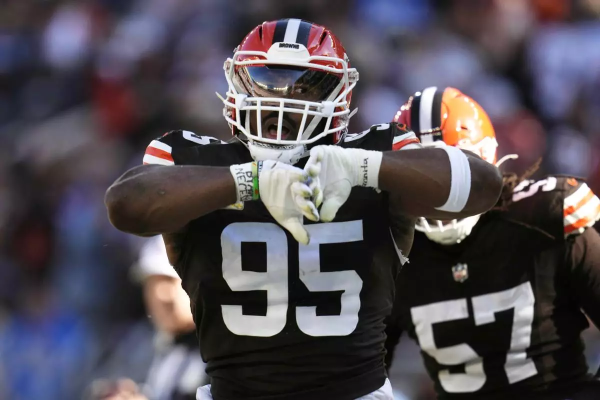 Cleveland Browns defensive end Myles Garrett (95) celebrates after sacking Los Angeles Chargers quarterback Justin Herbert in the first half of an NFL football game Sunday, Nov. 3, 2024, in Cleveland. (AP Photo/Sue Ogrocki)