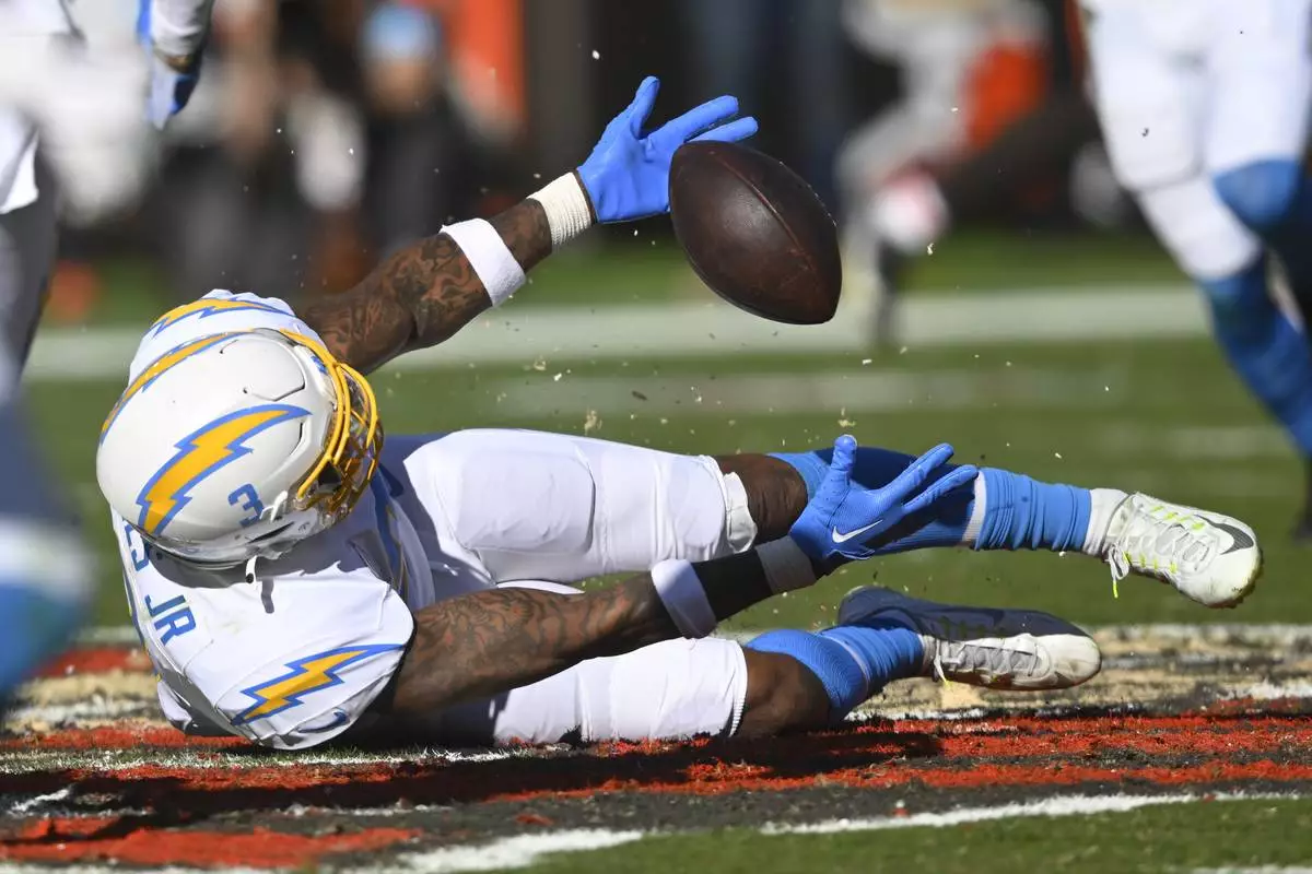 Los Angeles Chargers wide receiver Joshua Palmer (5) catches a touchdown pass against the Cleveland Browns in the first half of an NFL football game Sunday, Nov. 3, 2024, in Cleveland. (AP Photo/David Richard)