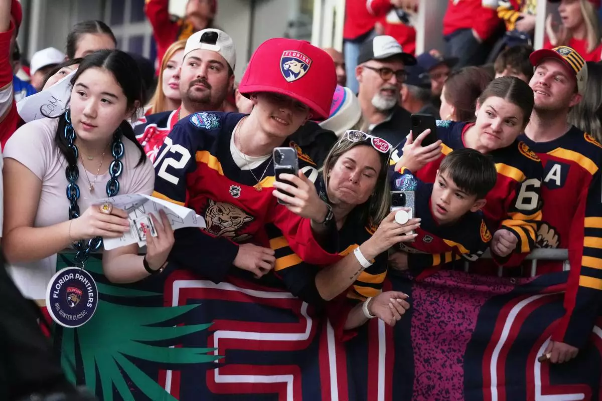 Fans watch as Florida Panthers players arrive before the NHL Winter Classic outdoor hockey game between the Florida Panthers and the New York Rangers, Friday, Jan. 2, 2026, in Miami. (AP Photo/Lynne Sladky)
