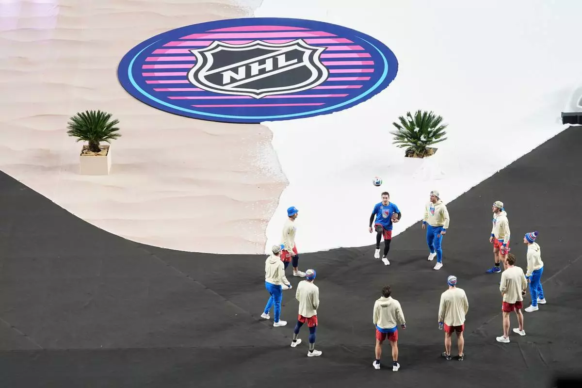 New York Rangers, including left wing Brett Berard, center, warm up with a soccer ball ahead of the start of the NHL Winter Classic outdoor hockey game at loanDepot Park, Friday, Jan. 2, 2026, in Miami. (AP Photo/Rebecca Blackwell)