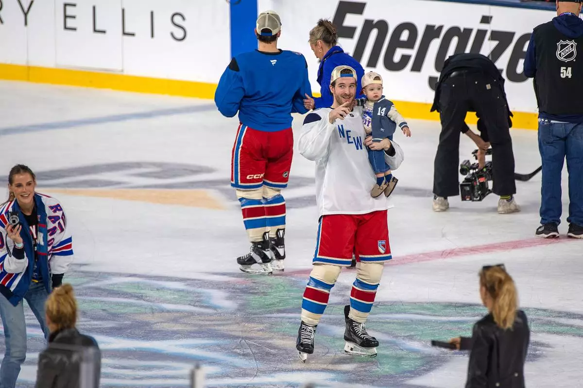 New York Rangers Taylor Raddysh enjoys family skate time after practice for the NHL Winter Classic outdoor hockey game, Thursday, Jan. 1, 2026, in Miami. (AP Photo/Michael Laughlin)