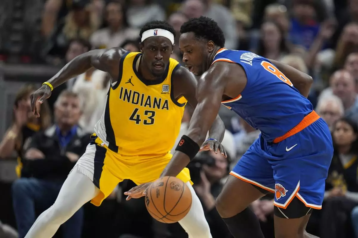 New York Knicks' OG Anunoby (8) is defended by Indiana Pacers' Pascal Siakam (43) during the second half of an NBA basketball game, Sunday, Nov. 10, 2024, in Indianapolis. (AP Photo/Darron Cummings)