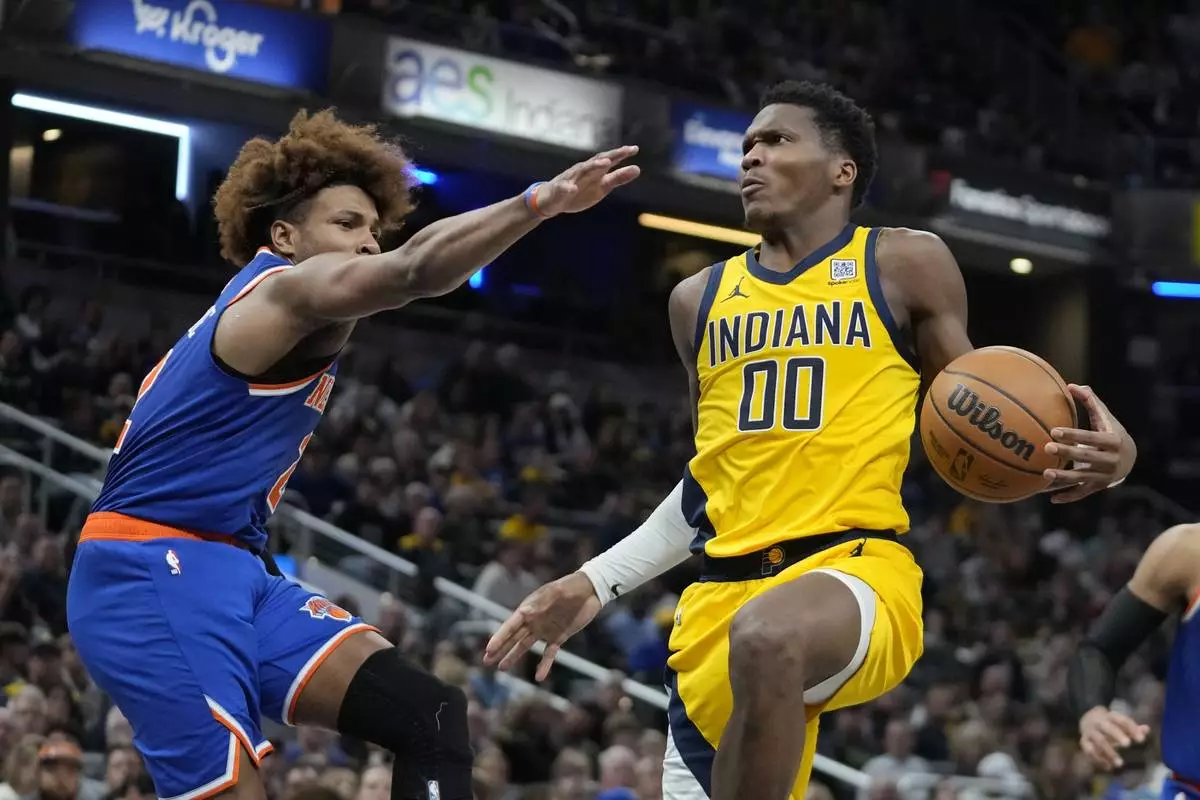 Indiana Pacers' Bennedict Mathurin (00) looks to shoot against New York Knicks' Miles McBride, left, during the second half of an NBA basketball game, Sunday, Nov. 10, 2024, in Indianapolis. (AP Photo/Darron Cummings)
