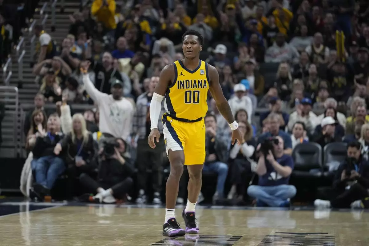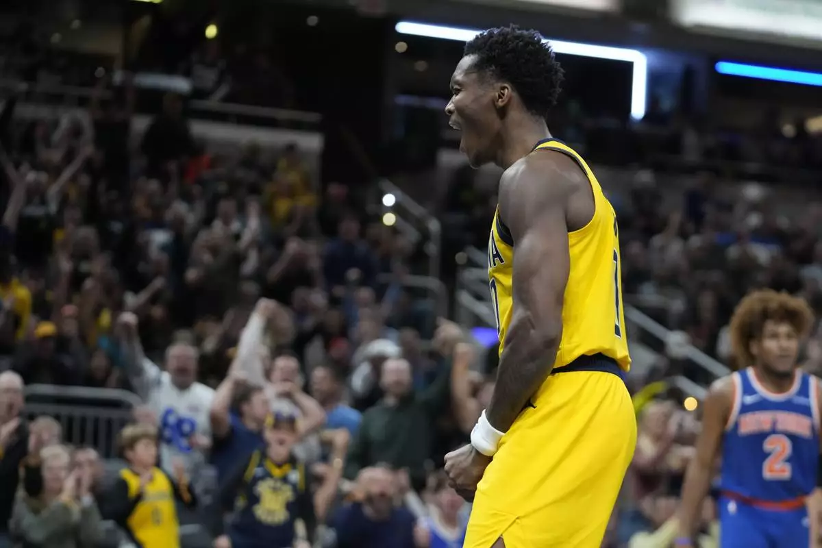 Indiana Pacers' Bennedict Mathurin reacts after hitting a 3-point basket during the second half of an NBA basketball game against the New York Knicks, Sunday, Nov. 10, 2024, in Indianapolis. (AP Photo/Darron Cummings)