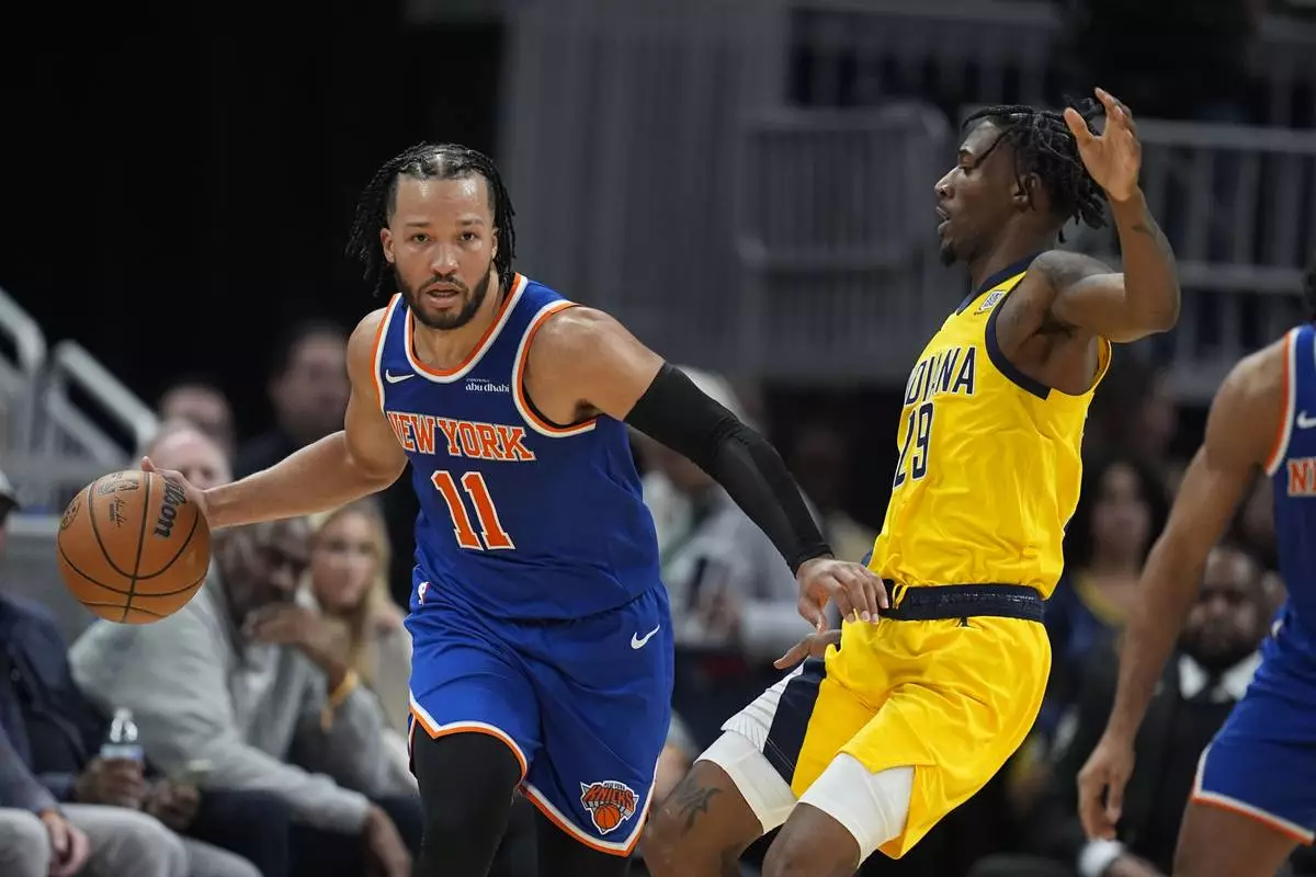 New York Knicks' Jalen Brunson (11) is defended by Indiana Pacers' Quenton Jackson (29) during the second half of an NBA basketball game, Sunday, Nov. 10, 2024, in Indianapolis. (AP Photo/Darron Cummings)