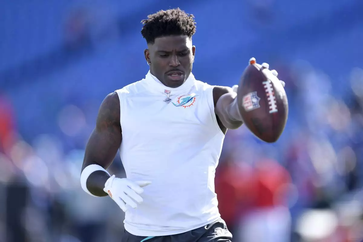 Miami Dolphins wide receiver Tyreek Hill warms up before an NFL football game against the Buffalo Bills, Sunday, Nov. 3, 2024, in Orchard Park, N.Y. (AP Photo/Adrian Kraus)