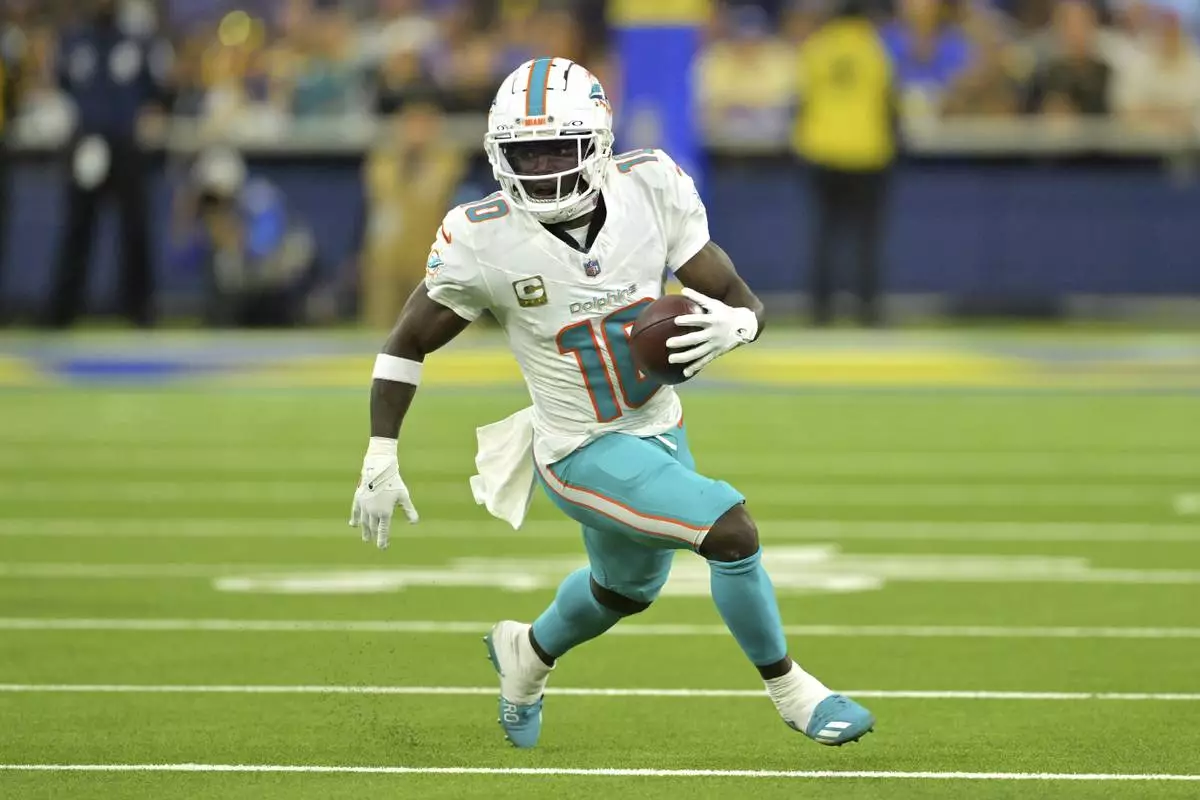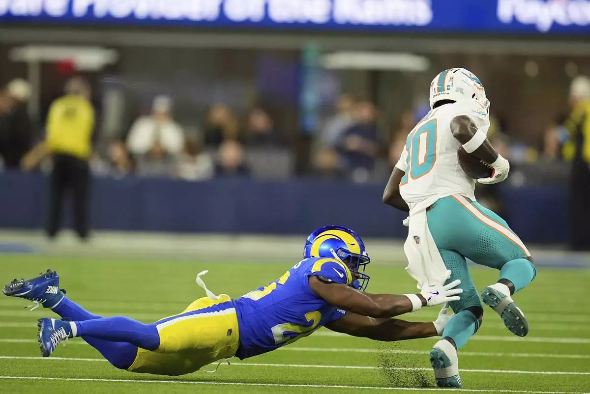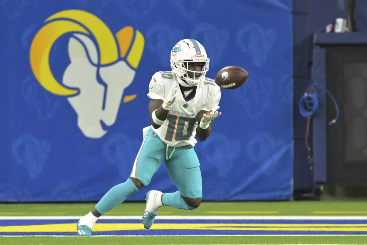 INGLEWOOD, Calif. (AP) — It wasn't certain if Miami Dolphins wide receiver Tyreek Hill would be available against the Los Angeles Rams on Monday night. Not only did he play, Hill ended the longest touchdown drought of his NFL career in Miami's 23-15 win.