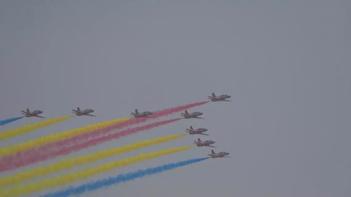 The footage showed that eight aircraft of China's Red Falcon Aerobatic Team flew high in the sky, trailing spectacular colored smoke to pay tribute to visitors with unique etiquette.