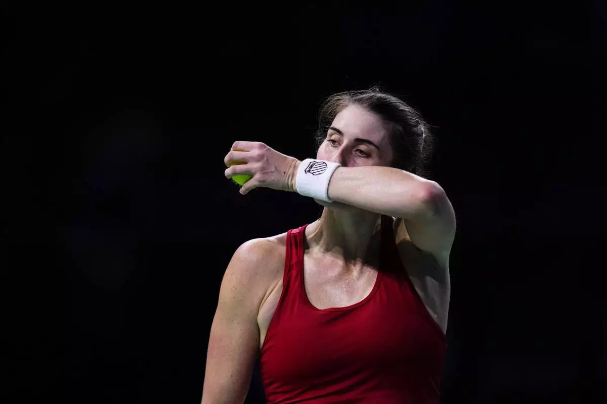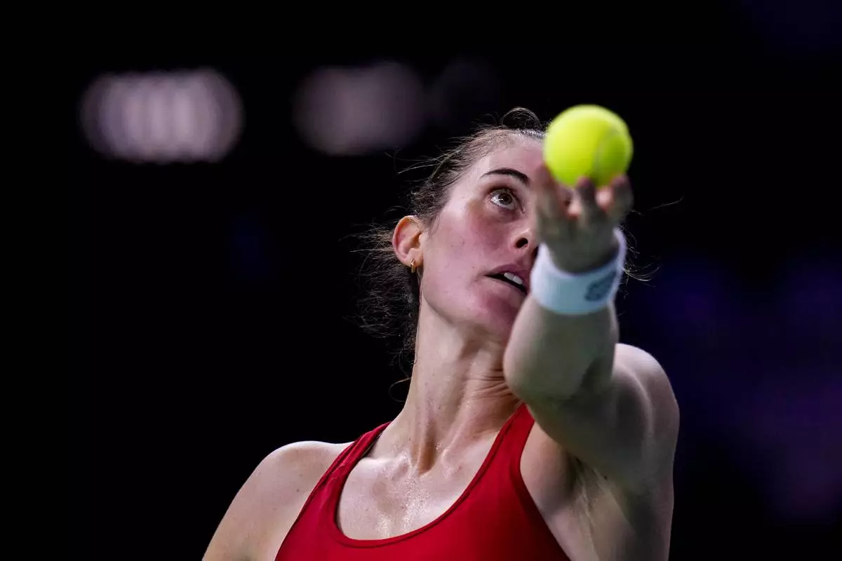 Canada's Rebecca Marino reacts during her match against Emma Raducanu of Britain during the Billie Jean King Cup Finals, at the Martin Carpena Sports Hall, in Malaga, southern Spain, on Sunday, Nov. 17, 2024. (AP Photo/Manu Fernandez)