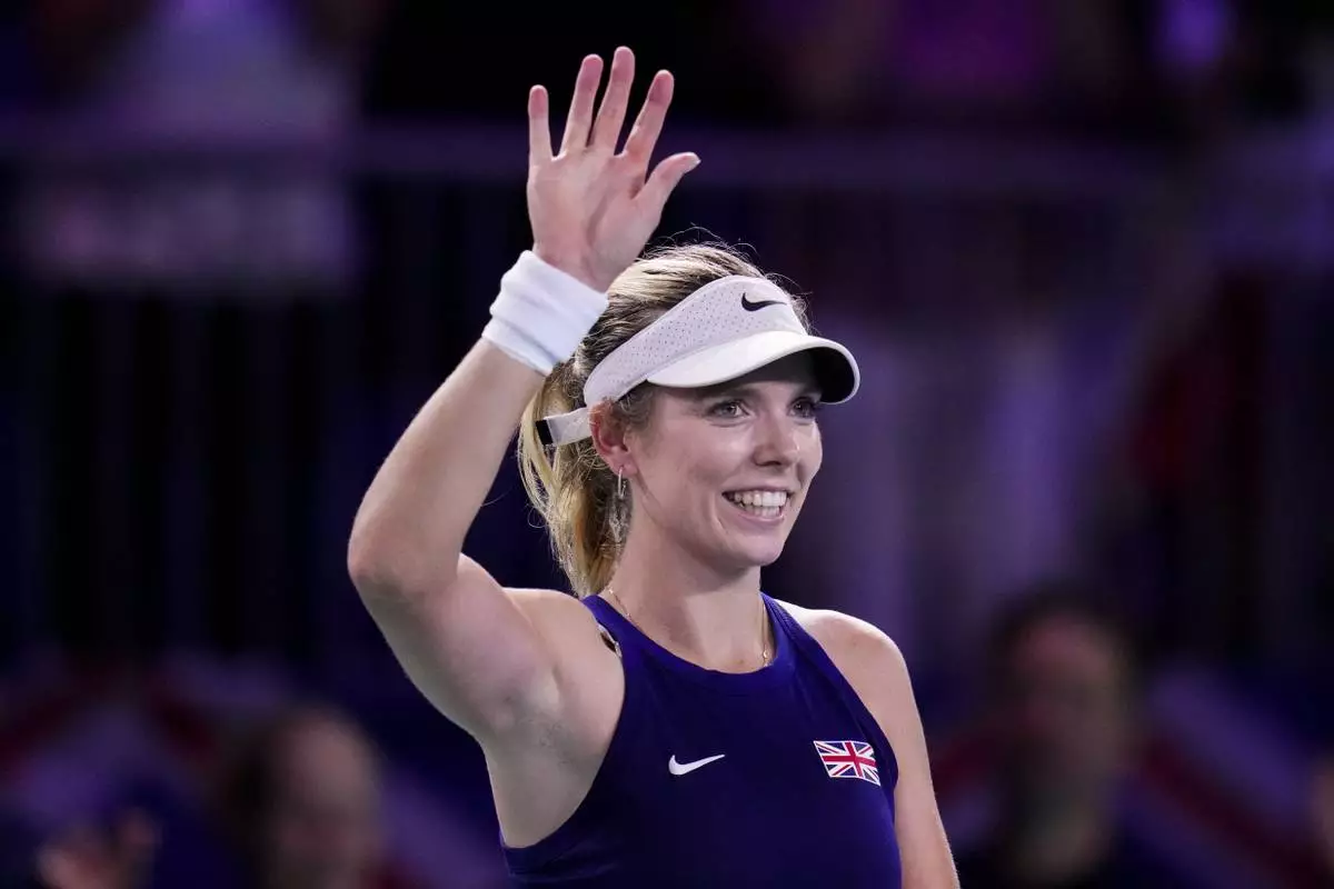 Katie Boulter, of Britain, celebrates after her victory against Canada's Leylah Fernandez in the Billie Jean King Cup Finals at Martin Carpena Sports Hall in Malaga, southern Spain, Sunday, Nov. 17, 2024. (AP Photo/Manu Fernandez)