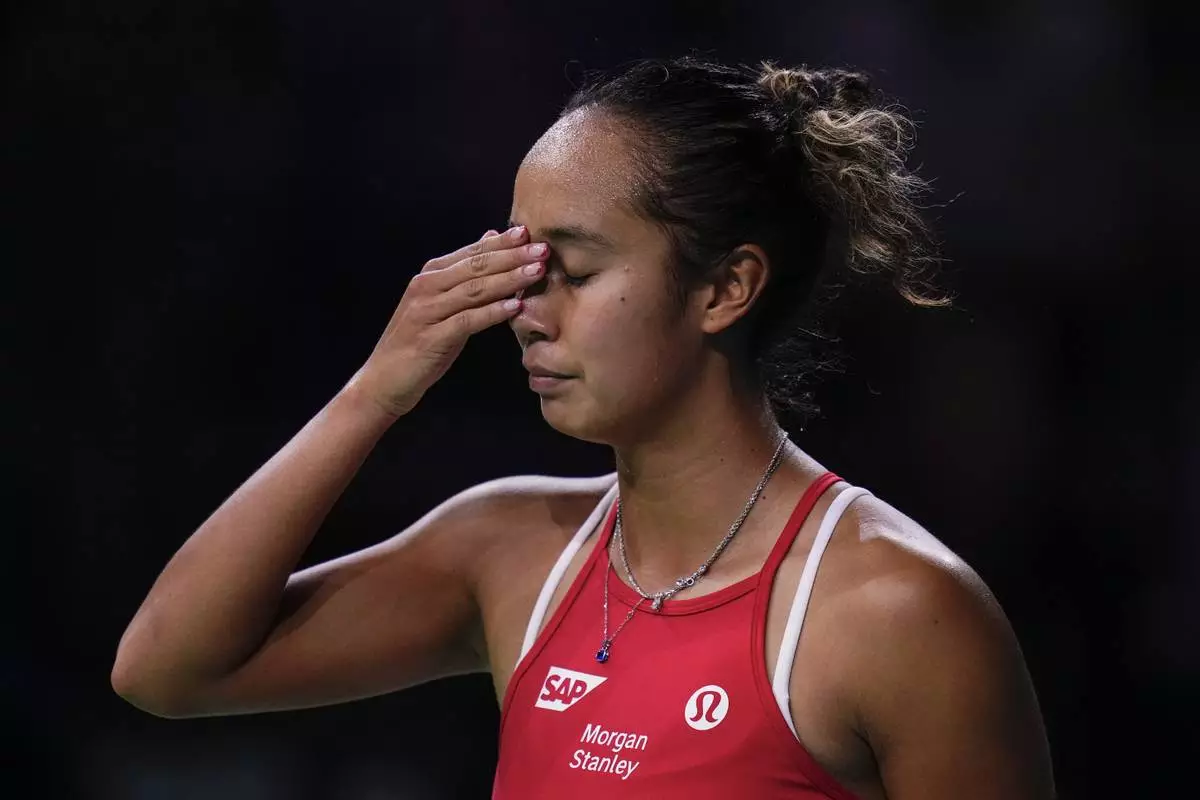 Canada's Leylah Fernandez reacts during haer match against Katie Boulter, of Britain, during the Billie Jean King Cup Finals at Martin Carpena Sports Hall in Malaga, southern Spain, Sunday, Nov. 17, 2024. (AP Photo/Manu Fernandez)