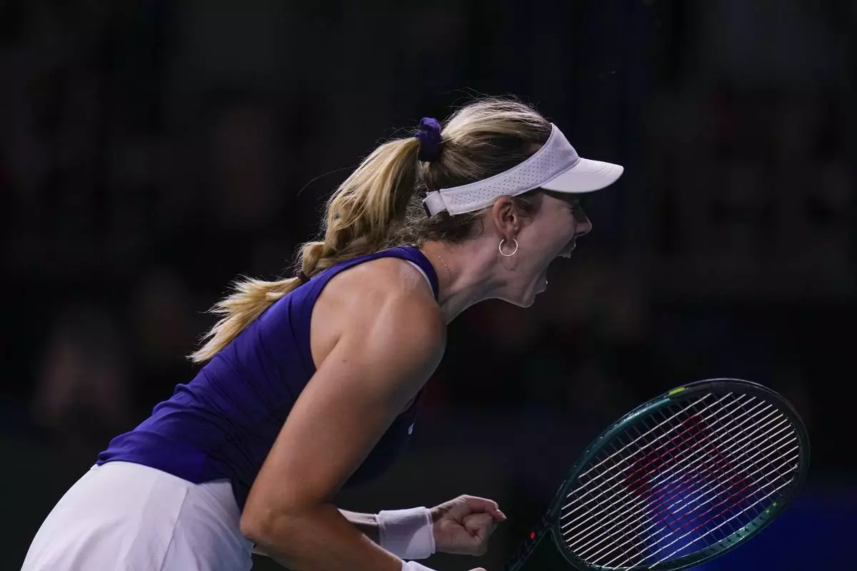 Australia's Kimberly Birrell reacts during the match against Slovakia's Viktoria Hruncakova in the Billie Jean King Cup Finals, at the Martin Carpena Sports Hall, in Malaga, southern Spain, on Sunday, Nov. 17, 2024. (AP Photo/Manu Fernandez)