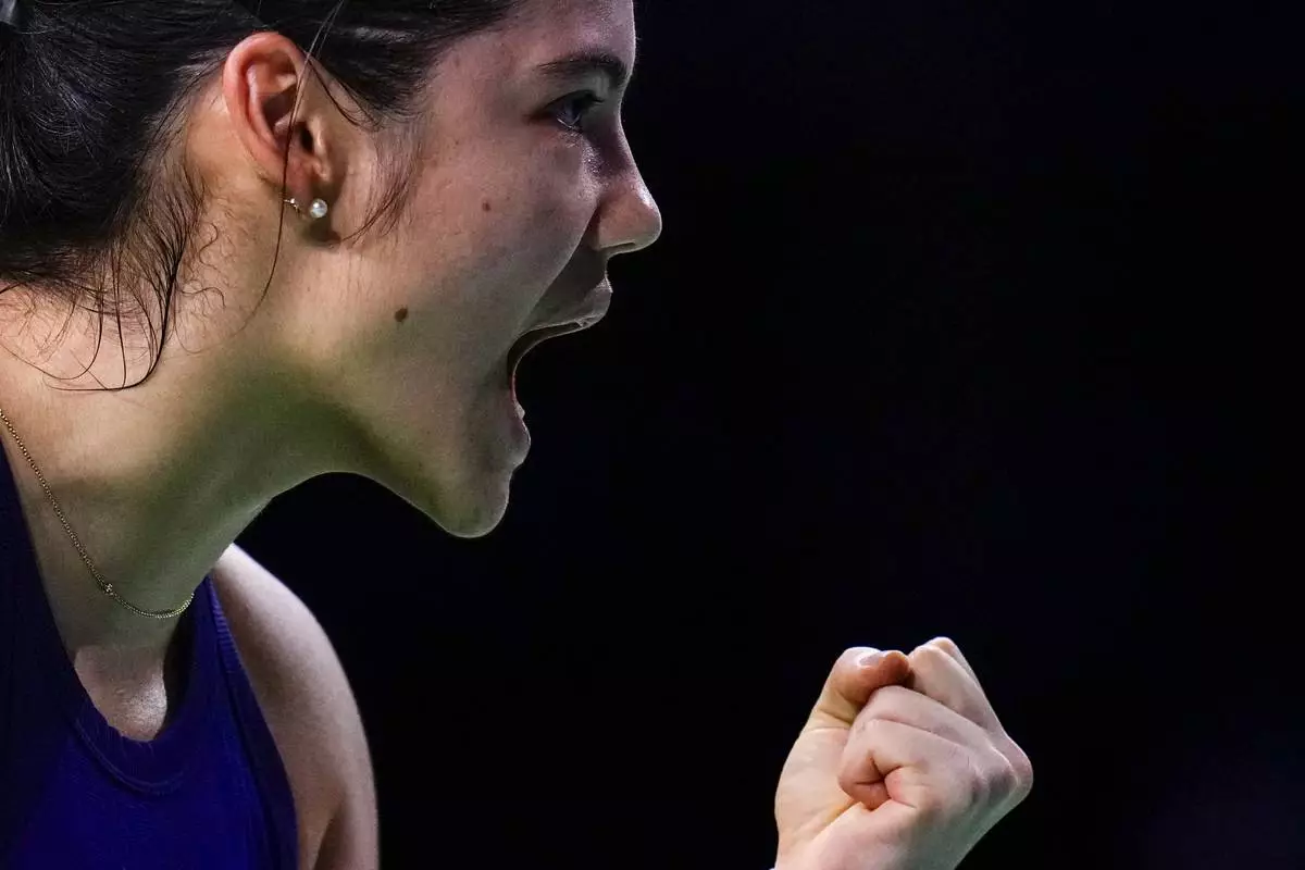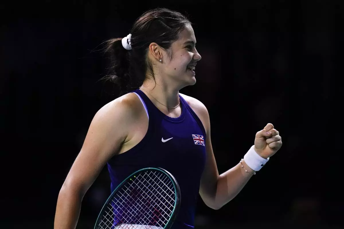 Emma Raducanu of Britain celebrates after winning the match against Canada's Rebecca Marino during the Billie Jean King Cup Finals, at the Martin Carpena Sports Hall, in Malaga, southern Spain, on Sunday, Nov. 17, 2024. (AP Photo/Manu Fernandez)
