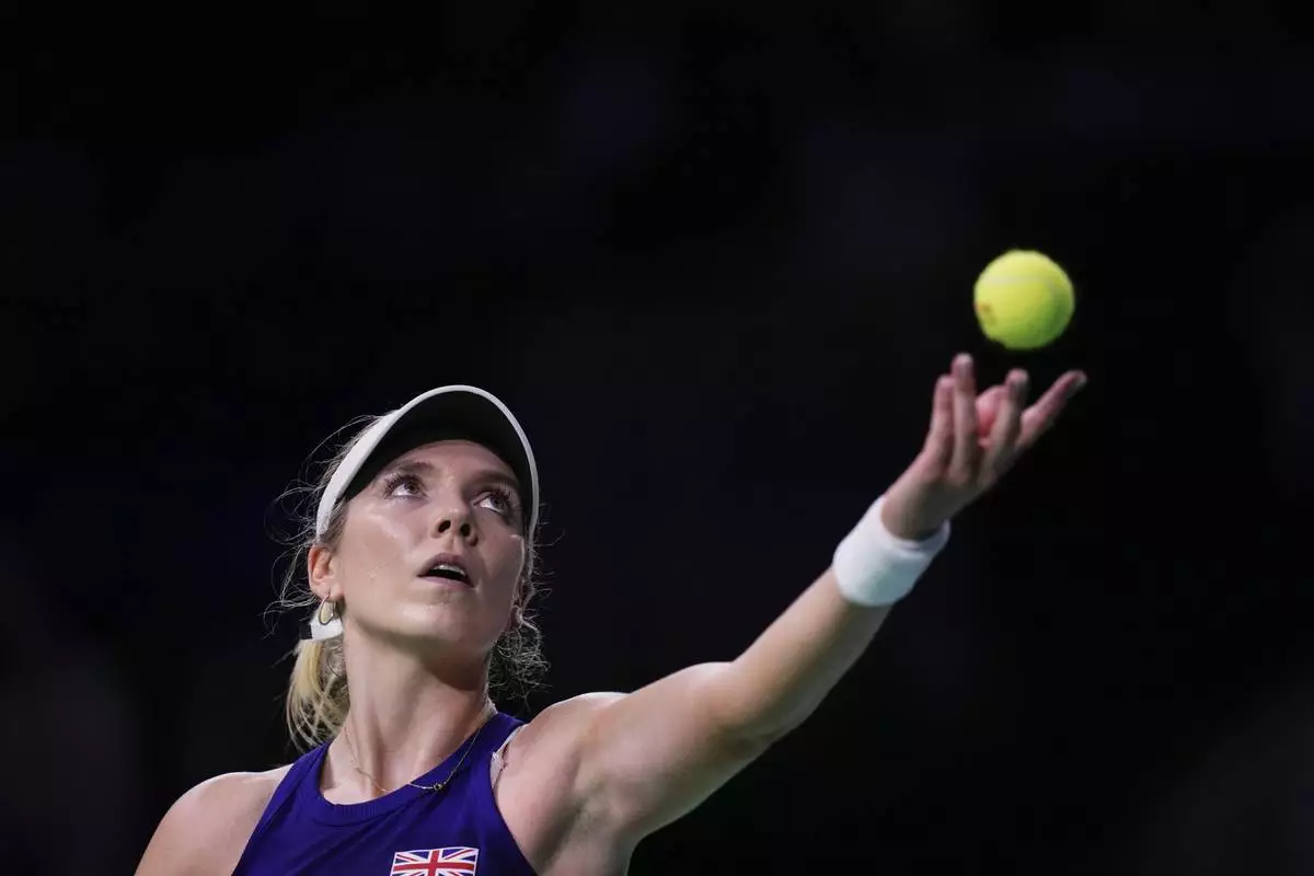 Katie Boulter, of Britain, serves against Canada's Leylah Fernandez during the Billie Jean King Cup Finals at Martin Carpena Sports Hall in Malaga, southern Spain, Sunday, Nov. 17, 2024. (AP Photo/Manu Fernandez)