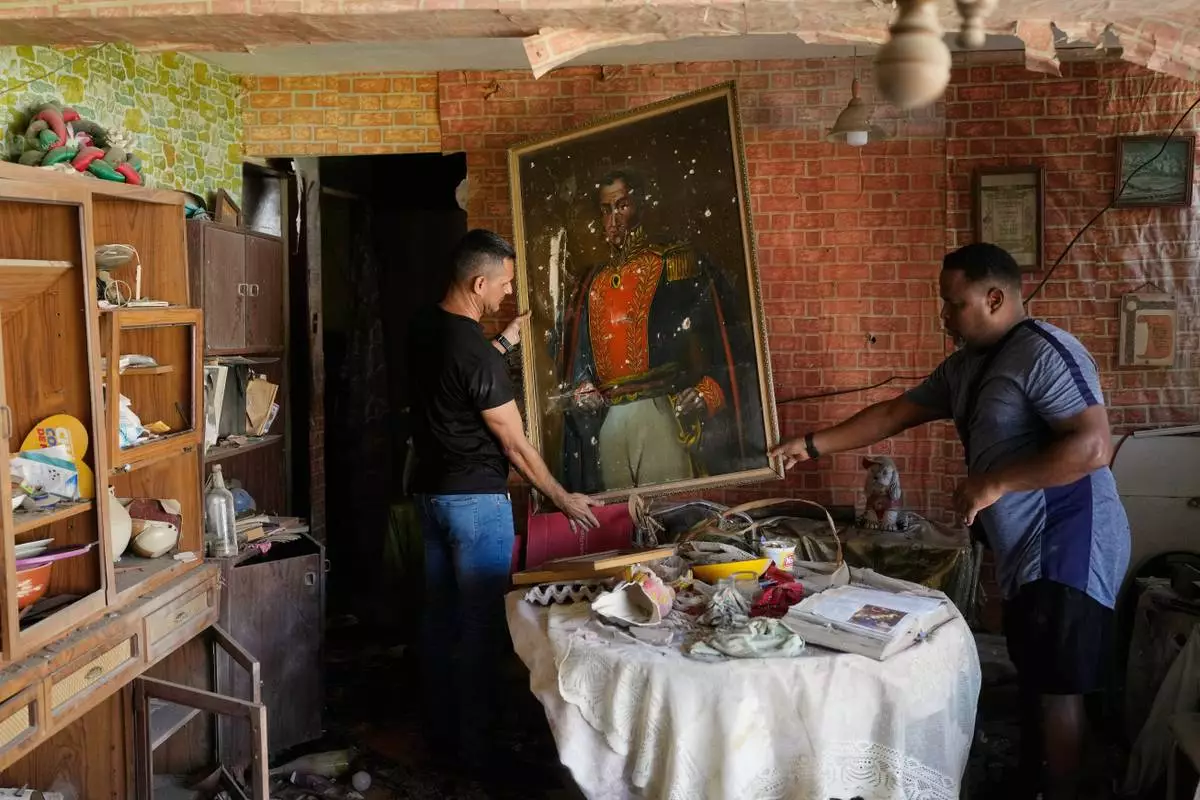 Jesus Linares, right, removes a painting of independence hero Simon Bolivar at his home, which he says was hit during U.S. military operations to capture Venezuelan President Nicolas Maduro, in Catia La Mar, Venezuela, Sunday, Jan. 4, 2026. (AP Photo/Matias Delacroix)