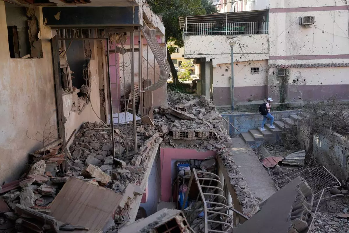 A neighbor walks through an apartment building that residents say was damaged during U.S. military operations to capture Venezuelan President Nicolás Maduro, in Catia La Mar, Venezuela, Sunday, Jan. 4, 2026. (AP Photo/Matias Delacroix)